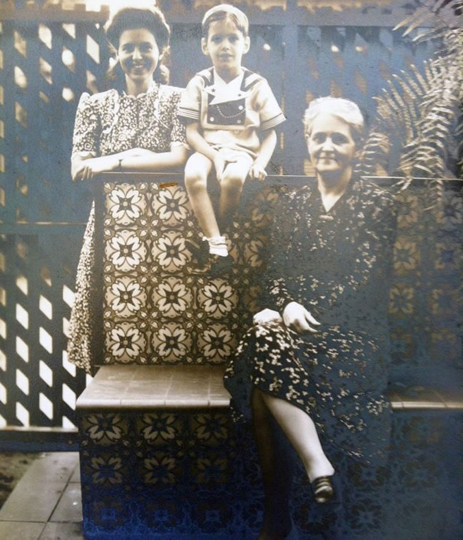 1941 – Minha mãe Hortense Marinho (1914-1976), eu e minha avó Cecilia do Val Marinho (1879-1973) no caramanchão da minha casa em Santos.