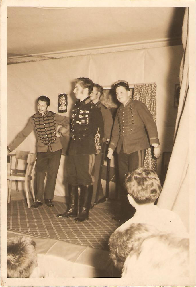 1954 -Lausanne (Suiça) : escrevi uma peça de teatro onde atuei como um general sul americano cheio de medalhas. A peça terminou e os atores agradecem os merecidos aplausos.