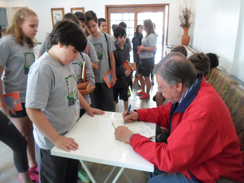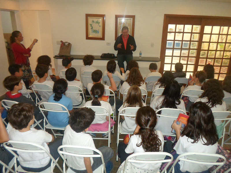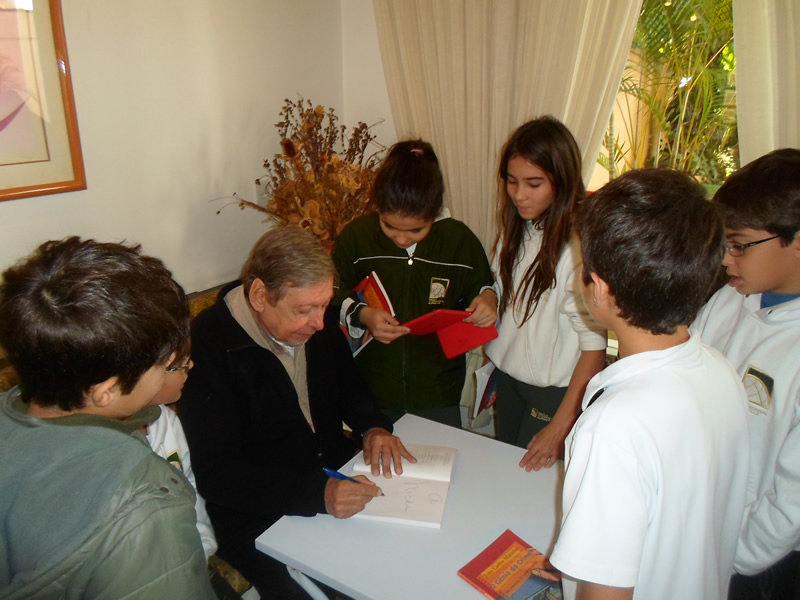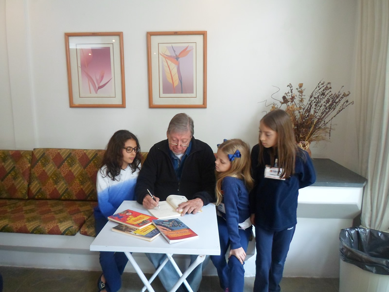 | Encerramento da entrevista: Pela euforia evidente dos alunos da Escola Bakhita se vê que gostaram imensamente do contato com o autor. |